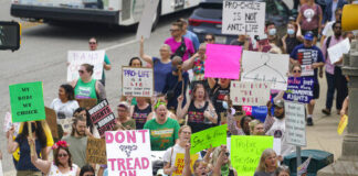 Protestors surround Statehouse Monday as state lawmakers consider GOP proposal to...
