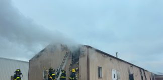 Columbus firefighters at scene of large warehouse fire, a portion of...