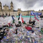 Colombian waste pickers inundate iconic Bogota square with plastic bottles to protest falling wages