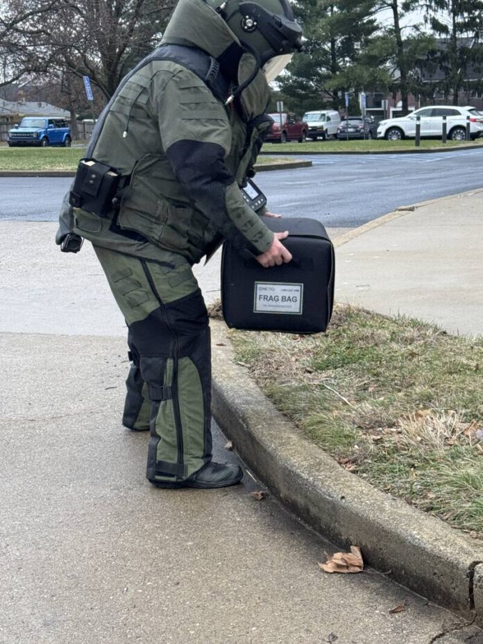 A member of the Columbus Police Department’s Hazardous Devices Unit removes a suspected explosive device from the Centerstone parking lot in Columbus, Ind., Tuesday, Dec. 23, 2025. The device was later determined to be a ‘hoax’ bomb.