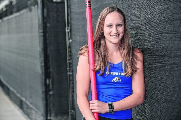 The 2019 girls track season was a huge bounce-back year for Adrienne Salemme. The Columbus North junior had a successful high school debut as a freshman when she cleared 10 feet, 4 inches in the pole vault and placed in the regional. But last year, she made only 9-10 and no-heighted in the regional. This spring, Salemme was in top form. She made 11-6 twice and qualified for the state finals, tying for 13th place and earning The Republic Girls Track Athlete of the Year honors. “I’m really excited about how this year went,” Salemme said. “Coming back after last year, I expected it to be a good season. I didn’t realize how good of a season it was actually going to be. It was definitely my best season yet.” Salemme made 11-6 at both the Franklin Sectional and Shelbyville Regional, narrowly missing 11-10 at the regional. But she injured her heel in practice two days before the state meet. She cleared 11-3 at state, but couldn’t get over 11-6. “I was really happy, especially (setting a personal record) in the tournament, then matching my PR again at regional,” Salemme said. “That was really exciting. I’m disappointed in my performance at state, but some of that is due to my injury. I put my best out there.” In the offseason, Salemme trailed with the Pole Vault Elite club out of Fortville and coach Collin Gayde. “Definitely my training over the summer after my sophomore year helped a lot, especially with the confidence and with my speed and my technique,” Salemme said. “Coming into this year with the confidence, that helped.” During the season, Salemme works with longtime North pole vault coach Dale Stelting. “I am absolutely proud of the hard work and dedication that Adrienne has put in this year,” Stelting said. “It’s not necessarily at the end of the season the way we wanted, the way we pictured it, but she has learned to vault tough, to take third attempts and make things work when it’s not working as well. (State) was frustrating for a variety of reasons, but I’m very much looking forward to seeing her progress next year.” A former club gymnast, Salemme gave up that sport after her freshman year. She has served as a manager for the Bull Dogs gymnastics team the past three years. Salemme is hoping to pole vault in college. She has heard from several schools, including Division I Dayton, and wants to major in exercise science or exercise physiology with the plan to become a physician’s assistant. “I’m extremely proud of how hard she works,” North head coach Lou Sipe said. “She works at pole vault and works extremely hard. Obviously, pole vault is a very technical event, and she’s embraced that and really taken to the work that goes into it. She’s very deserving, so I’m happy for her.”