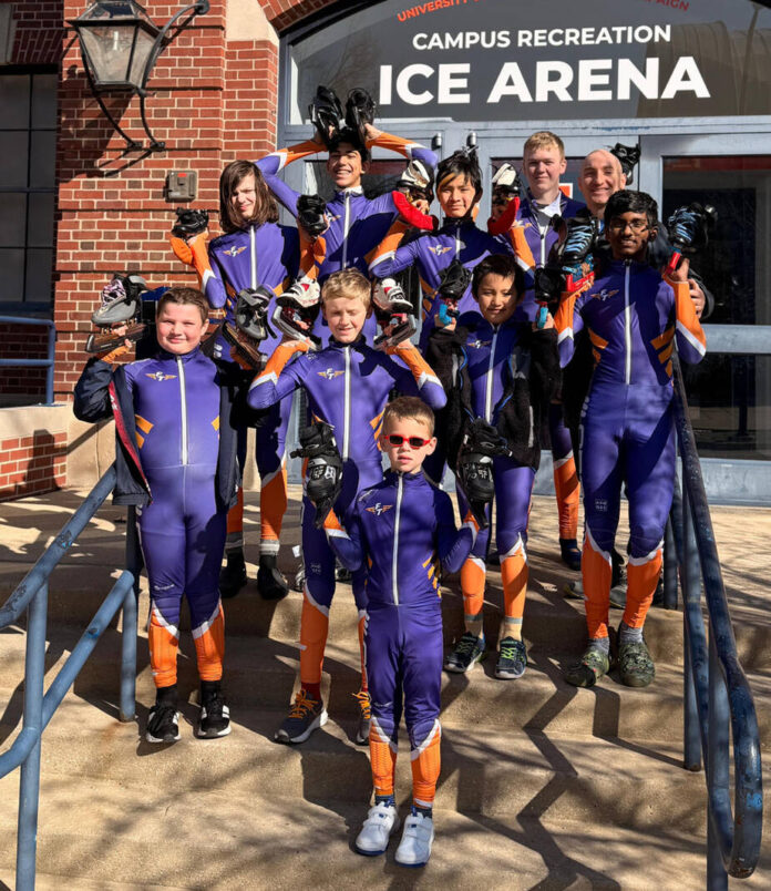 Full Throttle Speed Skating competed in the Land of Lincoln Championship at University of Illinois Ice Arena. Pictured are Oliver Meir, front; and second row from left, Finn Phipps, Edward Meir, Ethan Tan, Rithwik Veeravalli; and back row, Quin Fortner, Vivaan Gupta, Luis Marimoto Taqueushi, Wyatt Kiefer and coach Mikey Burdekin.