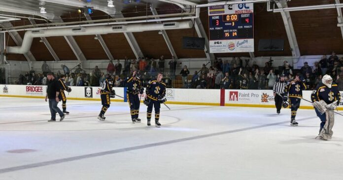 Indiana Sentinels players leave the ice following Friday’s 4-3 loss to Topeka at Hamilton Community Center and Ice Arena.